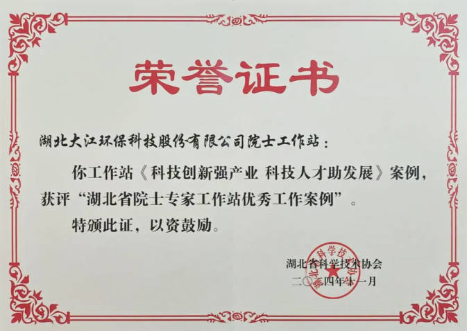 在湖北省科学技术协会最新公布的2024年度全省院士专家工作站评选中,大江公司院士工作站以卓越的科研创新力、高效的产学研一体化模式,在推动环保科技发展方面的显著贡献,脱颖而出,以“科技创新强产业,科技人才助发展”案例获评“湖北省院士专家工作站优秀工作案例”。